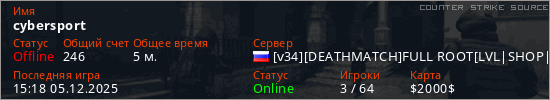 Играет на Counter Strike Source сервере. Страна: РоссияПервый раз замечен 14:25 05.12.2025