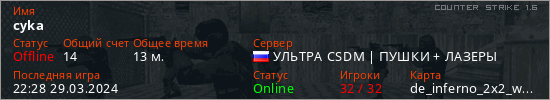 Играет на Counter Strike 1.6 сервере. Страна: РоссияПервый раз замечен 21:30 29.03.2024