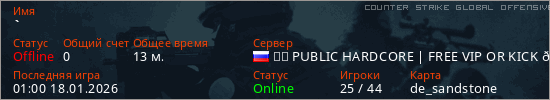 Играет на Counter Strike Global Offensive сервере. Страна: РоссияПервый раз замечен 19:47 21.07.2025