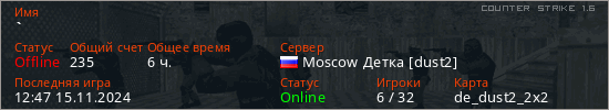 Играет на Counter Strike 1.6 сервере. Страна: РоссияПервый раз замечен 18:31 21.10.2020