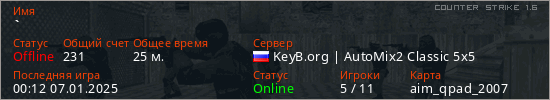 Играет на Counter Strike 1.6 сервере. Страна: РоссияПервый раз замечен 21:39 06.01.2025