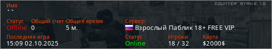 Играет на Counter Strike 1.6 сервере. Страна: РоссияПервый раз замечен 15:07 02.10.2025