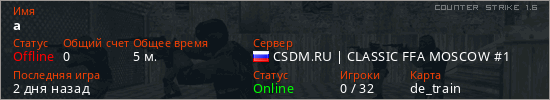 Играет на Counter Strike 1.6 сервере. Страна: РоссияПервый раз замечен 22:46 04.03.2026