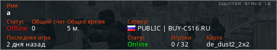 Играет на Counter Strike 1.6 сервере. Страна: РоссияПервый раз замечен 18:02 15.03.2026