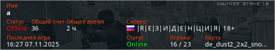 Играет на Counter Strike 1.6 сервере. Страна: РоссияПервый раз замечен 16:39 17.12.2022