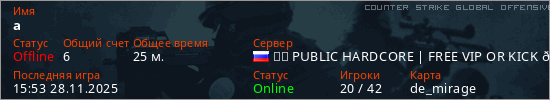 Играет на Counter Strike Global Offensive сервере. Страна: РоссияПервый раз замечен 02:16 25.02.2025