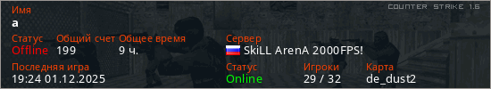 Играет на Counter Strike 1.6 сервере. Страна: РоссияПервый раз замечен 13:21 29.07.2022