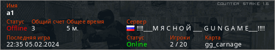 Играет на Counter Strike 1.6 сервере. Страна: РоссияПервый раз замечен 22:11 05.02.2024