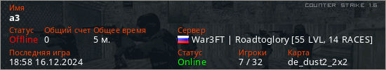 Играет на Counter Strike 1.6 сервере. Страна: РоссияПервый раз замечен 18:54 16.12.2024