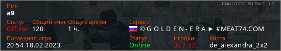 Играет на Counter Strike 1.6 сервере. Страна: РоссияПервый раз замечен 19:40 18.02.2023