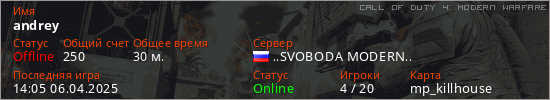 Играет на Call of Duty 4: Modern Warfare сервере. Страна: РоссияПервый раз замечен 20:26 01.03.2025