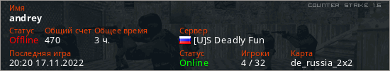 Играет на Counter Strike 1.6 сервере. Страна: РоссияПервый раз замечен 17:27 25.03.2022