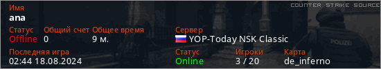 Играет на Counter Strike Source сервере. Страна: РоссияПервый раз замечен 04:16 12.08.2024
