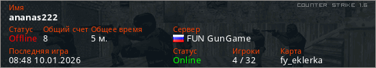 Играет на Counter Strike 1.6 сервере. Страна: РоссияПервый раз замечен 08:45 10.01.2026
