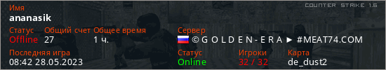 Играет на Counter Strike 1.6 сервере. Страна: РоссияПервый раз замечен 11:42 22.05.2023