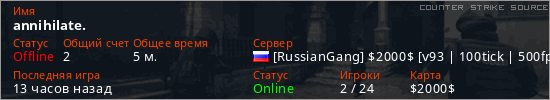 Играет на Counter Strike Source сервере. Страна: РоссияПервый раз замечен 19:20 17.03.2026
