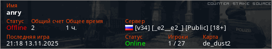 Играет на Counter Strike Source сервере. Страна: РоссияПервый раз замечен 14:04 14.01.2024