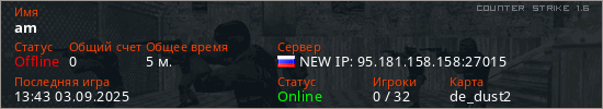 Играет на Counter Strike 1.6 сервере. Страна: РоссияПервый раз замечен 13:30 03.09.2025
