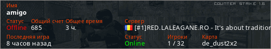 Играет на Counter Strike 1.6 сервере. Страна: РумынияПервый раз замечен 18:45 13.07.2023
