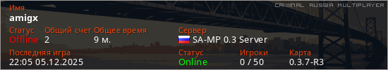 Играет на Criminal Russia Multiplayer сервере. Страна: РоссияПервый раз замечен 21:28 05.12.2025