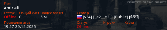 Играет на Counter Strike Source сервере. Страна: РоссияПервый раз замечен 19:55 29.12.2025
