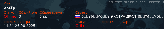 Играет на Counter Strike Global Offensive сервере. Страна: РоссияПервый раз замечен 13:52 26.08.2025