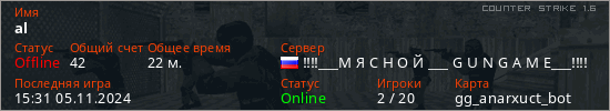Играет на Counter Strike 1.6 сервере. Страна: РоссияПервый раз замечен 18:07 17.10.2024