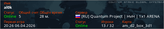 Играет на Counter Strike Global Offensive сервере. Страна: РоссияПервый раз замечен 20:26 06.04.2026