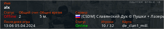 Играет на Counter Strike 1.6 сервере. Страна: РоссияПервый раз замечен 13:02 05.04.2024