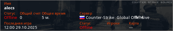 Играет на Counter Strike Source сервере. Страна: РоссияПервый раз замечен 11:45 29.10.2025