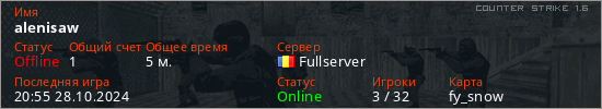 Играет на Counter Strike 1.6 сервере. Страна: РумынияПервый раз замечен 20:53 28.10.2024