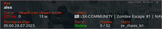 Играет на Counter Strike 1.6 сервере. Страна: СШАПервый раз замечен 19:26 27.07.2025
