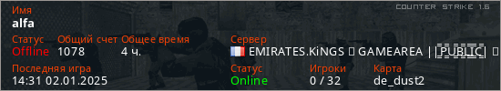 Играет на Counter Strike 1.6 сервере. Страна: ФранцияПервый раз замечен 12:03 30.12.2024