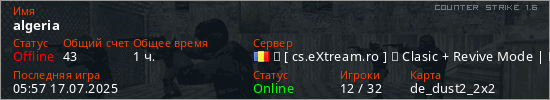 Играет на Counter Strike 1.6 сервере. Страна: РумынияПервый раз замечен 03:38 16.01.2025
