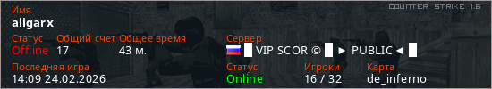 Играет на Counter Strike 1.6 сервере. Страна: РоссияПервый раз замечен 21:06 14.02.2026