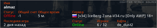Играет на Counter Strike Source сервере. Страна: РоссияПервый раз замечен 21:21 22.03.2026