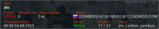 Играет на Counter Strike 1.6 сервере. Страна: РоссияПервый раз замечен 09:32 04.08.2025