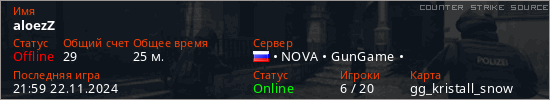 Играет на Counter Strike Source сервере. Страна: РоссияПервый раз замечен 13:56 19.11.2024