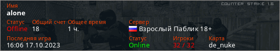 Играет на Counter Strike 1.6 сервере. Страна: РоссияПервый раз замечен 16:46 26.04.2020