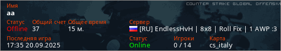 Играет на Counter Strike Global Offensive сервере. Страна: РоссияПервый раз замечен 16:09 20.09.2025