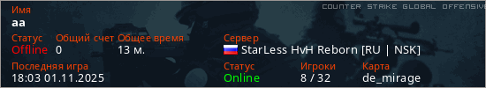 Играет на Counter Strike Global Offensive сервере. Страна: РоссияПервый раз замечен 17:48 01.11.2025