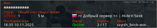 Играет на Counter Strike 1.6 сервере. Страна: РоссияПервый раз замечен 18:20 10.11.2025