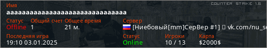Играет на Counter Strike 1.6 сервере. Страна: РоссияПервый раз замечен 18:10 13.11.2024