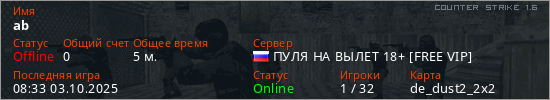 Играет на Counter Strike 1.6 сервере. Страна: РоссияПервый раз замечен 08:31 03.10.2025