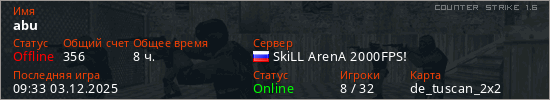 Играет на Counter Strike 1.6 сервере. Страна: РоссияПервый раз замечен 17:55 06.07.2022