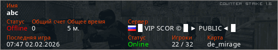 Играет на Counter Strike 1.6 сервере. Страна: РоссияПервый раз замечен 07:45 02.02.2026