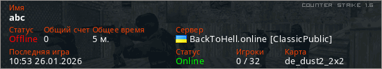 Играет на Counter Strike 1.6 сервере. Страна: УкраинаПервый раз замечен 10:51 26.01.2026