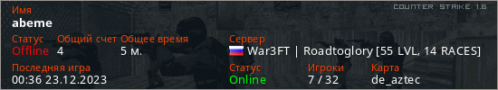 Играет на Counter Strike 1.6 сервере. Страна: РоссияПервый раз замечен 00:28 23.12.2023