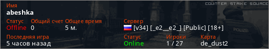 Играет на Counter Strike Source сервере. Страна: РоссияПервый раз замечен 18:05 07.02.2026