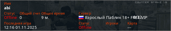 Играет на Counter Strike 1.6 сервере. Страна: РоссияПервый раз замечен 15:39 07.02.2025